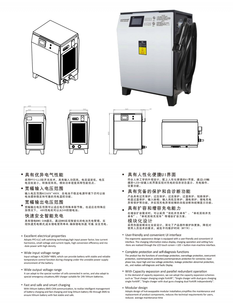 觸摸屏智能操作設計:告別傳統按鍵方式,給您帶來更現代更具科技智能的操作體驗 自動充電:插槍自動充電,簡化充電流程,便于操作 兼容性高:80V200A兼容48V200A充電 多重保護: 輸出短路,過流過壓保護,反接保護,電流導管保護等多重保護 預約充電功能:避開高峰用電時段,有效節省成本 雙語切換:中英文雙語隨需切換,跨越語言障礙,與世界接軌 人性化設計:充電機背板內部附部件明細及產品接線圖,方便客戶可更清楚的了解產品,便于維修,提高售后時效 獨特設計: 內置電磁鎖驅動模塊,防止臨時斷電鎖槍 使用壽命更長:功率模塊預留20%空間,提高模塊的使用壽命 出色內部結構: 內部結構左右出風,內部電路不容易積粉塵,提高充電機壽命