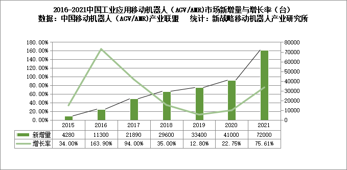 圖表:2015-2021中國市場企業(yè)工業(yè)應(yīng)用移動機(jī)器人(AGV/AMR)新增量(臺)與增長率