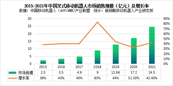 圖表:2015-2021年中國叉式移動機器人市場銷售規模(億元)及增長率