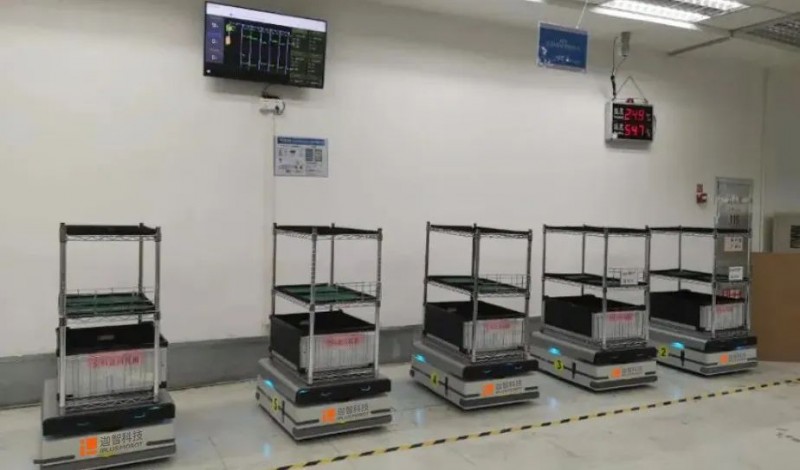 國內首例百級無塵環境AMR應用項目。用戶通過迦智科技提供的智造物流整體解決方案,實現在2000平米的百級潔凈車間內,種類繁多,形狀、大小、質量各異的三大種類、十余種物料,在產線各道工序間的自主柔性周轉,保障了物料供給的時效性和準確率,后續進行二次復購。