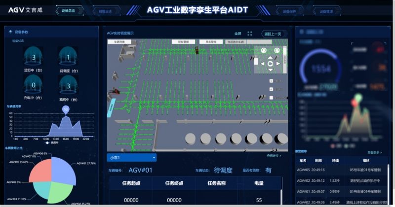 然而,小A的故事還沒有結束?;诎赓M贈送的數字化工廠AIDT(艾吉威工業數字孿生)平臺,小A可以做一些維護保養的事項。該平臺可采集每輛小千斤的所有信息,包括故障、速度、電量、任務等,可實現對所有機器人產品的實時監控與故障排查,真正實現小千斤產品的遠程運維。