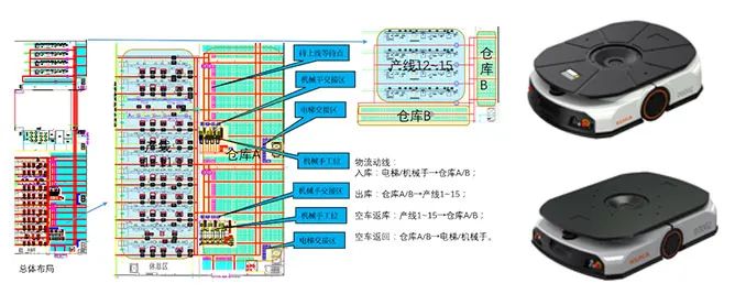 該鈑金生產(chǎn)工廠,制造車間共分兩大庫區(qū),共計15條產(chǎn)線,600+庫位,現(xiàn)場需融合機械臂生產(chǎn)入庫,采用水墨屏數(shù)字化管理,并部署AMR自主移動機器人搬運料車自動入庫、配送至產(chǎn)線,同時使用RFID技術(shù)實現(xiàn)智能物料盤點,最終實現(xiàn)兩大庫區(qū)內(nèi)的智能化高效生產(chǎn)。