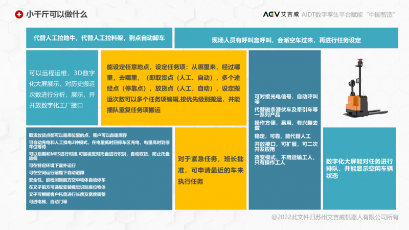 艾吉威機器人“小千斤”AGV,其設計特點手自一體多種模式,適用于物料多、載具不統一、配送作業繁忙、廠區面積大、配送距離遠、物料員作業方式不統一的制造型企業。數字化大平臺免費贈送,應用不斷免費升級,更加符合當下“數實融合”、“智改數轉”的發展大勢。“小千斤”寓意千斤重擔小意思,大平臺寓意大數據平臺支撐,應用功能免費統一升級。