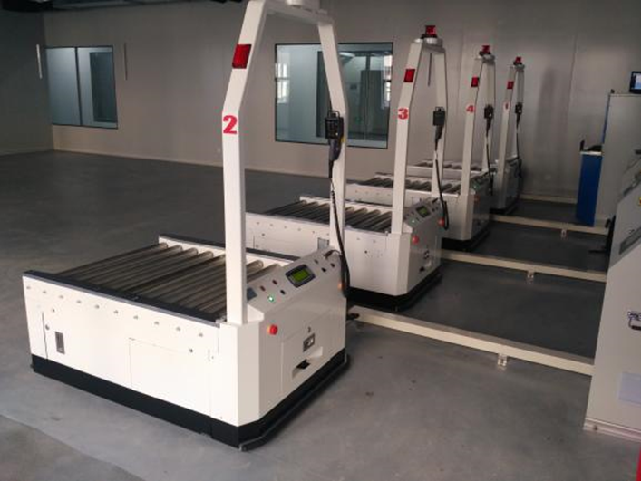 化成分容段采用輔助定位,保證側向背輥AGV與輥筒輸送機的精準對接?;煞秩荻魏徒M裝烘烤采用光通訊交互,實現AGV背輥和輥筒輸送機的同步傳動。AGV通道狹窄,對AGV的導航穩定可靠性、定位精度有極高的要求?;煞秩輲霢GV運行通道狹窄(寬2.8米),因此要求AGV設計比較小巧,滿足通道內雙向運行需求。化成分容庫AGV側面滾筒裝卸貨的設計,更符合現場多物流線多站臺的作業模式,能夠在站臺裝完即走?;煞秩輲霢GV四面防護的透明亞克力板罩設計,能有效隔離灰塵,同時滿足人工抽樣檢測電池的需求。