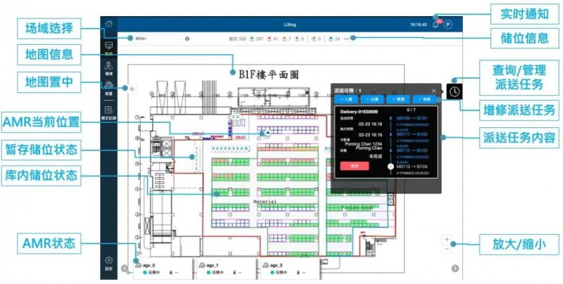 目前,中強光智能對調度系統及智慧倉儲系統已實現完全自主研發,其中包含車輛管理、任務規劃、任務排程、地圖管理等子功能,在應用中系統可自動依照操作任務對AMR進行派遣及路徑規劃,同時管理車隊調度、分析每日進出貨及車輛運行狀態等,具體如下: