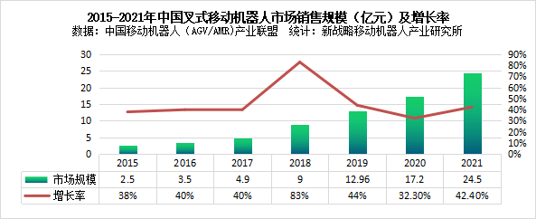 據(jù)中國移動(dòng)機(jī)器人(AGV/AMR)產(chǎn)業(yè)聯(lián)盟數(shù)據(jù)、新戰(zhàn)略移動(dòng)機(jī)器人產(chǎn)業(yè)研究所統(tǒng)計(jì),2021年中國叉式移動(dòng)機(jī)器人(含視覺導(dǎo)航)銷量達(dá)8000臺(tái),同比增長60%,市場規(guī)模約為24.5億元,同比增長42.40%。