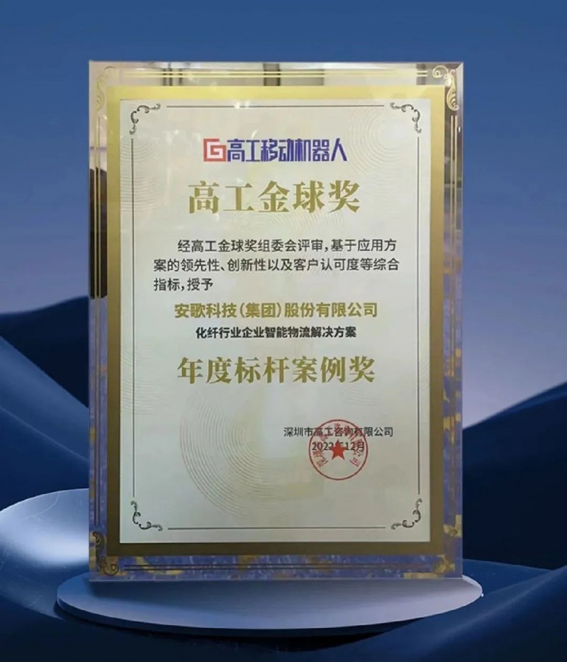 2022年12月安歌科技的化纖解決方案憑借優(yōu)秀的團隊配合度、創(chuàng)新的技術(shù)、杰出的集成能力,以及自研自產(chǎn)的硬件+軟件+系統(tǒng)+服務(wù)的創(chuàng)新集成模式,榮膺2022化纖行業(yè)企業(yè)智能物流解決方案 年度標桿案例獎。