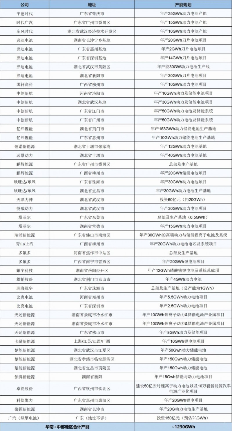 全國動力與儲能電池基地產能統計表3---華南+中部地區(qū)