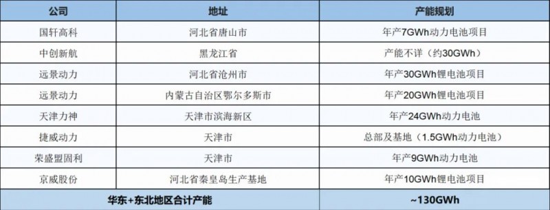 全國動力與儲能電池基地產能統計表2---華北+東北地區(qū)