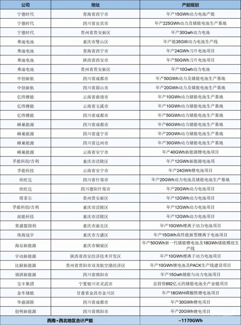 全國動力與儲能電池基地產能統計表4---西南+西北地區(qū)