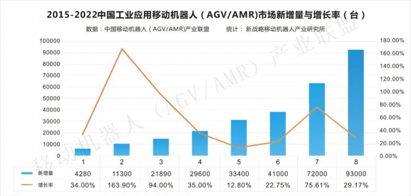圖表:2015-2022中國工業(yè)應(yīng)用移動(dòng)機(jī)器人(AGV/AMR)新增量與增長率