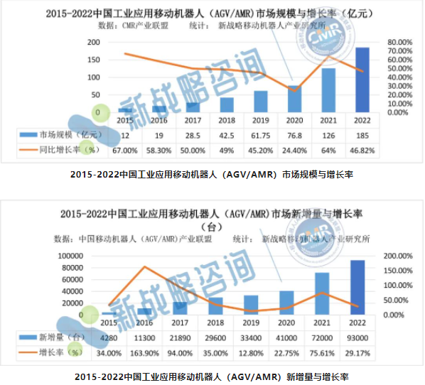 作為AGV/AMR的核心器件,AGV/AMR的市場(chǎng)規(guī)模決定了控制器的市場(chǎng)規(guī)模與空間。根據(jù)CMR產(chǎn)業(yè)聯(lián)盟數(shù)據(jù),新戰(zhàn)略移動(dòng)機(jī)器人產(chǎn)業(yè)研究所統(tǒng)計(jì),2022年度,中國(guó)市場(chǎng)企業(yè)整體銷售工業(yè)應(yīng)用移動(dòng)機(jī)器人(AGV/AMR)93000臺(tái),較2021年增長(zhǎng)29.17%,市場(chǎng)銷售額達(dá)到185億元,同比增長(zhǎng)46.83%。