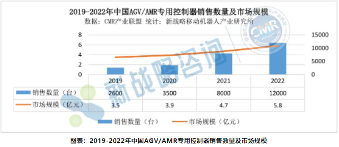 根據(jù)CMR產(chǎn)業(yè)聯(lián)盟數(shù)據(jù),新戰(zhàn)略移動(dòng)機(jī)器人產(chǎn)業(yè)研究所統(tǒng)計(jì),2022年AGV/AMR專用控制銷售數(shù)量約為12000臺(tái),同比增長(zhǎng)50%,市場(chǎng)規(guī)模在5.8億左右,同比增長(zhǎng)23.4%。