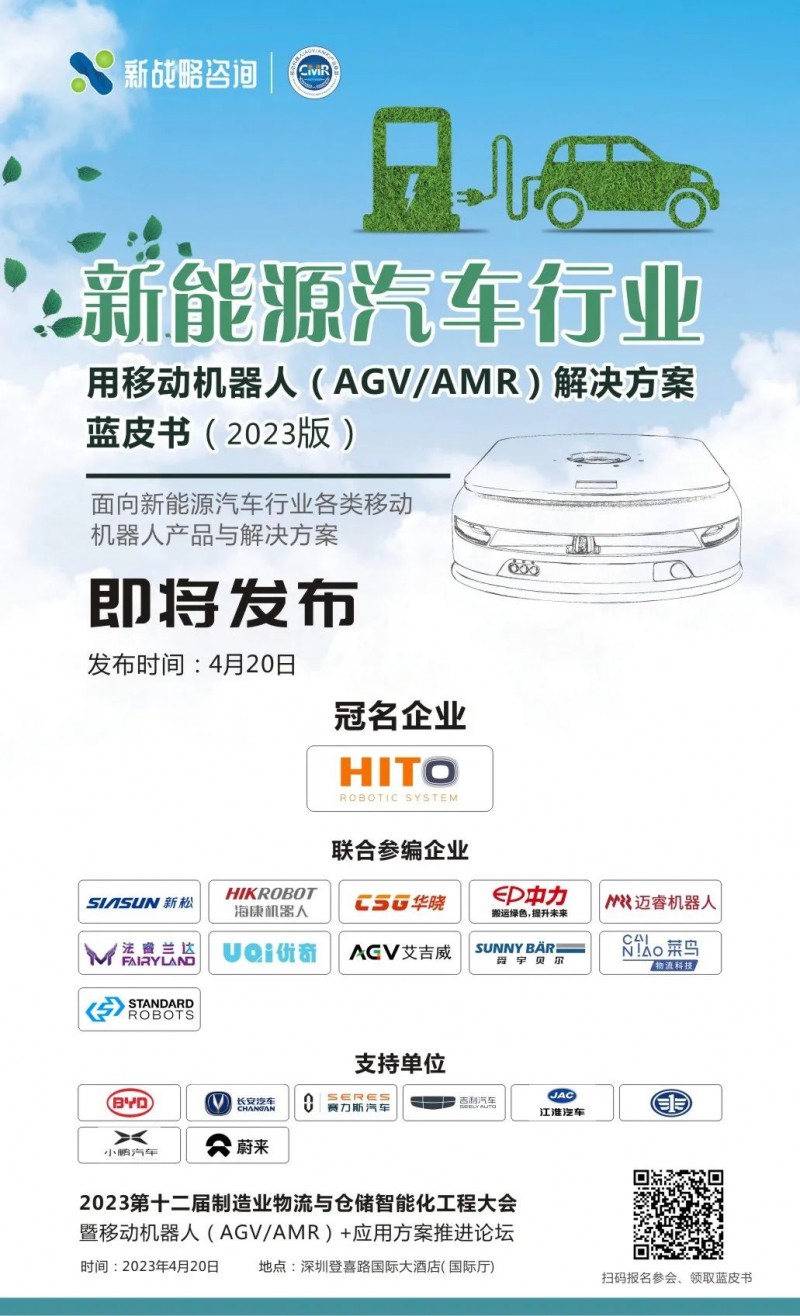 為更好地解析新能源汽車行業(yè)AGV/AMR應(yīng)用現(xiàn)狀,4月20日,在由新戰(zhàn)略移動(dòng)機(jī)器人以及新戰(zhàn)略咨詢聯(lián)合主辦的“2023第十二屆制造業(yè)物流與倉儲(chǔ)智能化工程大會(huì)“上,”新能源汽車行業(yè)用移動(dòng)機(jī)器人(AGV/AMR)解決方案藍(lán)皮書(2023版)“將正式發(fā)布!現(xiàn)場參會(huì)人員可免費(fèi)獲得藍(lán)皮書紙質(zhì)版一份!