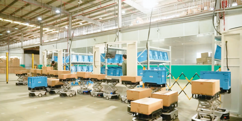 RS貨箱機器人與P40揀選機器人可實現(xiàn)同一場景下的并行高效協(xié)作,由RS料箱機器人負責貨箱在存儲位和緩存位間的上下轉移,P40揀選機器人從緩存位快速搬運貨箱至工作站進行揀選。