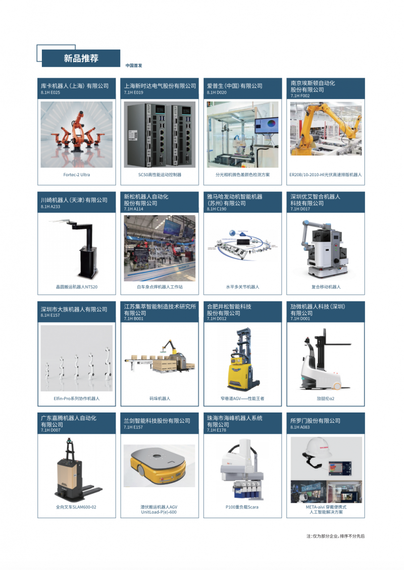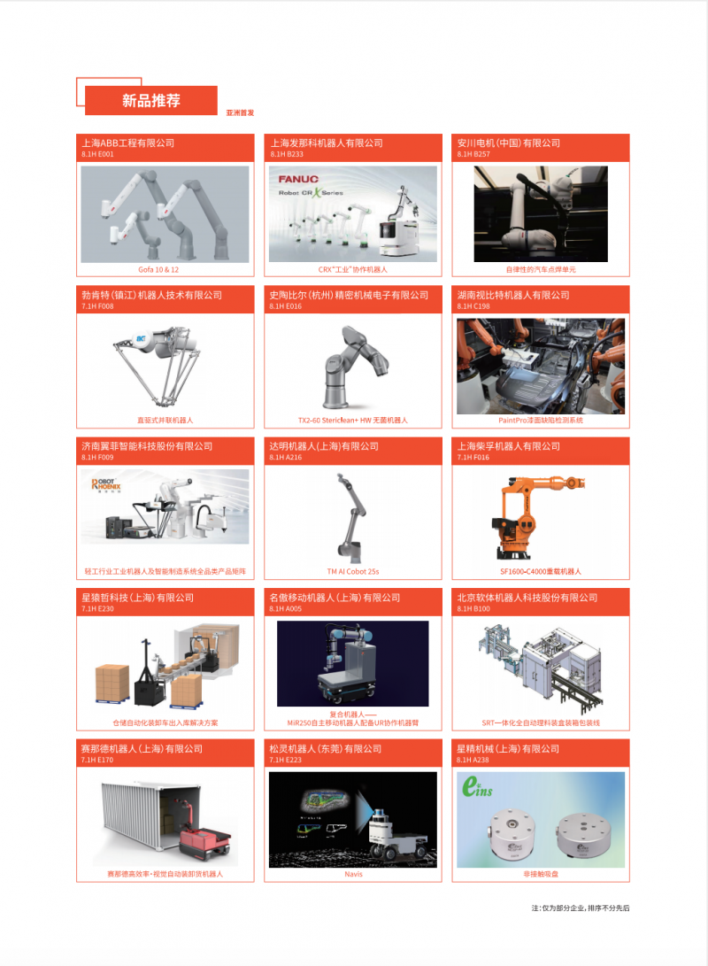 新品覆蓋了工業(yè)機器人本體、SCARA機器人、DELTA機器人、協(xié)作機器人、AGV/AMR、移動復合機器人、減速器控制器傳感器和伺服電機執(zhí)行器等核心零部件、軟件及系統(tǒng)集成應用等,彰顯最前沿的機器人技術(shù),為新型工業(yè)化注入新動能。