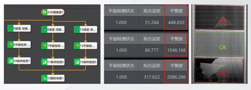 針對疊片和碎片缺陷檢測,VM 3D軟件中,深度圖像分別定位到每個硅片位置,統(tǒng)計每個硅片位置ROI內(nèi)平面度,根據(jù)平面度情況判斷硅片是否存在破碎和疊片。