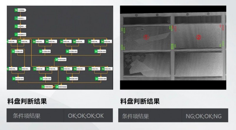 針對搭邊缺陷檢測,基于相機(jī)采集的深度圖像,導(dǎo)入VM 3D軟件中,依據(jù)mark點(diǎn)定位到每個料盤的四個角點(diǎn),分別在角點(diǎn)料坑上下曲小區(qū)域計算均值,可取四對或八對區(qū)域,比對料坑上下高度差值,正值為OK(綠色非搭邊框),負(fù)值為NG(紅色搭邊框)。