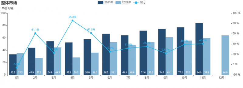 據(jù)中國汽車工業(yè)協(xié)會(huì)統(tǒng)計(jì),1-11月,汽車產(chǎn)銷累計(jì)完成2711.1萬輛和2693.8萬輛,同比分別增長10%和10.8%,增速較1-10月分別提升2和1.7個(gè)百分點(diǎn)。至此,2023年前11個(gè)月,汽車產(chǎn)銷量已超過2022年全年(2022年我國汽車產(chǎn)銷分別為2702.1萬輛和2686.4萬輛)。預(yù)測2023年中國汽車銷量或接近3000萬輛,同比增長可能超過10%,超過2017年的2888萬輛創(chuàng)歷史新高。