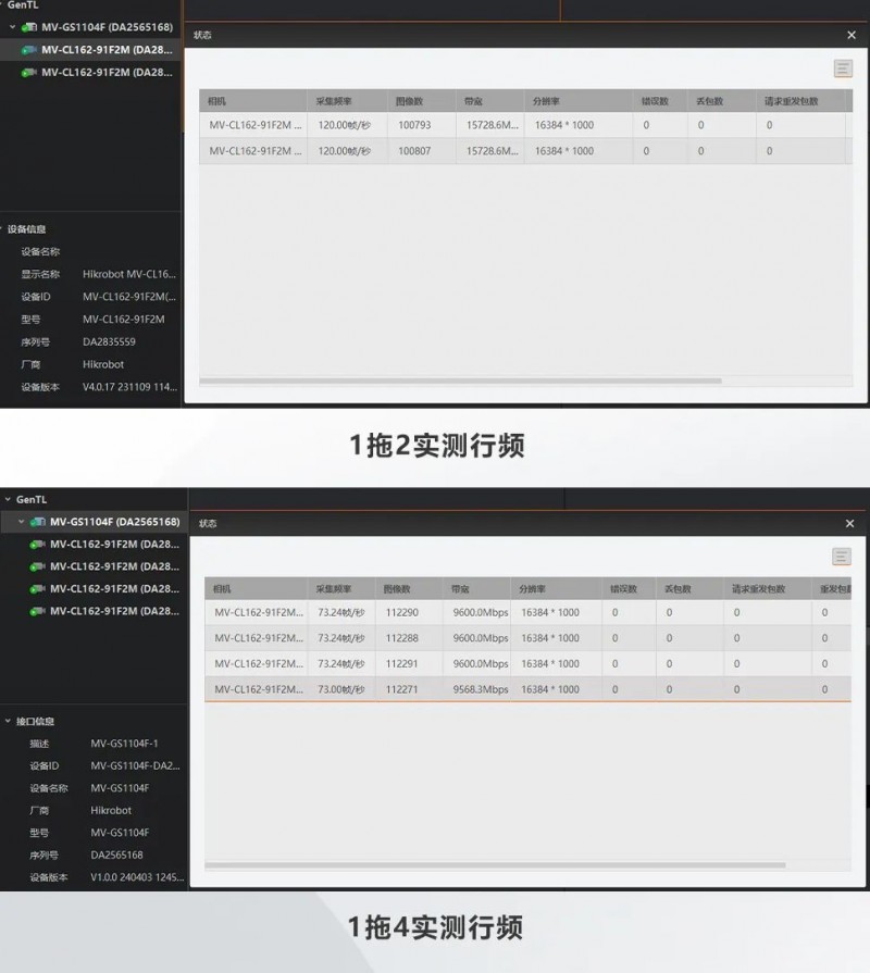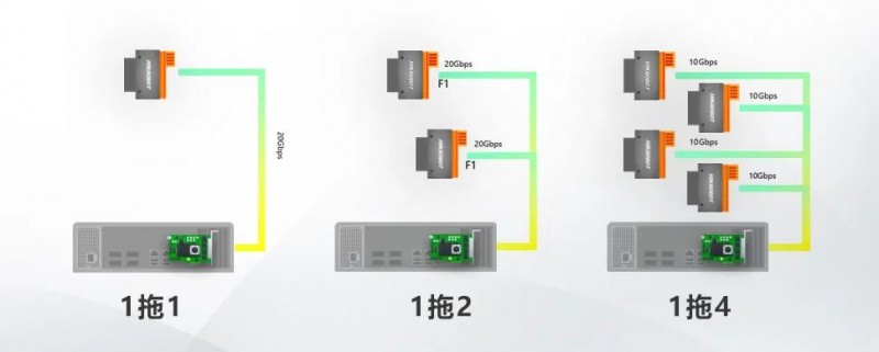 ??禉C(jī)器人推出了不同XoFlink接口數(shù)量的配套采集卡,搭配相機(jī)自身支持的1link和2link兩種工作模式,可支持1拖1、1拖2、1拖4等多種連接方式,安裝便捷。客戶可根據(jù)對行頻及整套方案的架設(shè)需求靈活選擇拓?fù)溥B接模式。