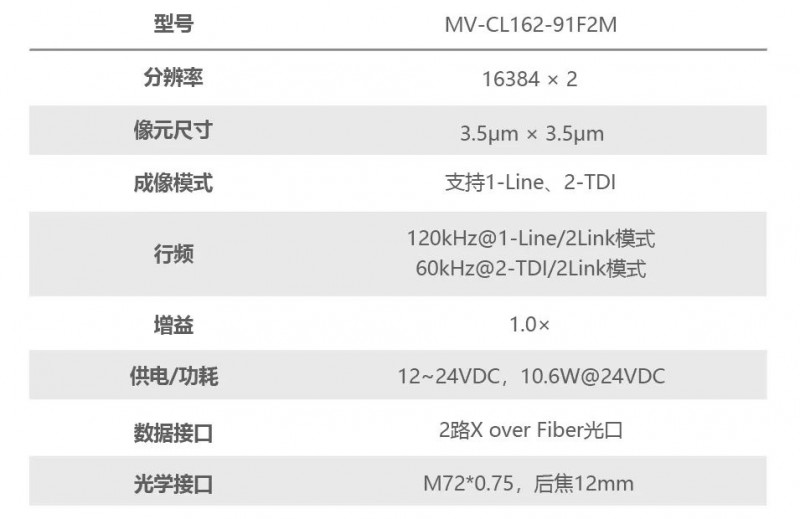 相機(jī)(MV-CL162-91F2M)采用兩線COMS Sensor,支持2-TDI成像,且在開啟2-TDI后可保持60kHz行頻高速采集,兼顧高速采集和亮度提升,降低視覺系統(tǒng)對環(huán)境光源的要求。