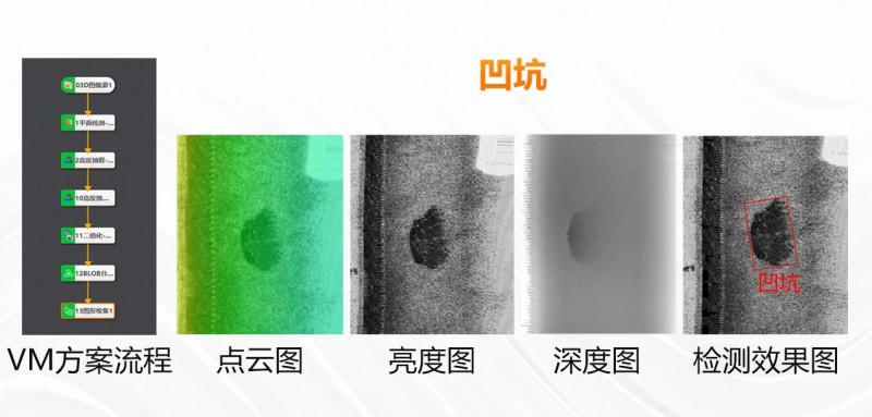 3D激光輪廓傳感器可有效識別缺陷、同時滿足生產(chǎn)節(jié)拍要求,完成全面檢測僅需旋轉(zhuǎn)一周。如下展示了鼓包、凹坑的實際測試圖像。