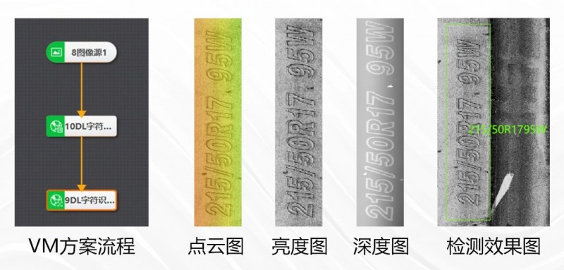 采用3D激光輪廓傳感器進行圖像采集,結(jié)合海康機器人AI訓練平臺,進行字符識別,可準確識別輪胎所有DOT碼。