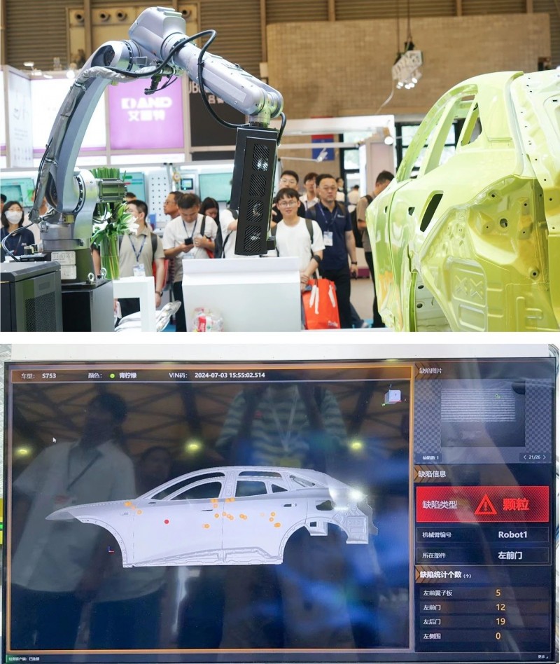 采用海康機器人自研的程控條紋光傳感器進行采圖,對車漆表面的顆粒,漆疤、劃痕、氣泡、針眼等缺陷進行在線全檢,最小可實現0.2mm的缺陷檢測,借助機械臂的柔性,檢測可達性區域幾乎覆蓋100%車身。