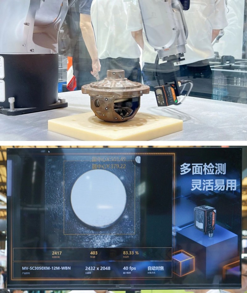 集成像、算法、存儲、通信于一身的SC3000X系列視覺傳感器,體積小巧,外觀緊湊,安裝更加靈活,內部嵌入了讀碼、有無、正反、測量、識別和計數等防錯檢測算法,搭配機械臂對鑄造件的各個面進行碼信息、字符信息的檢測。