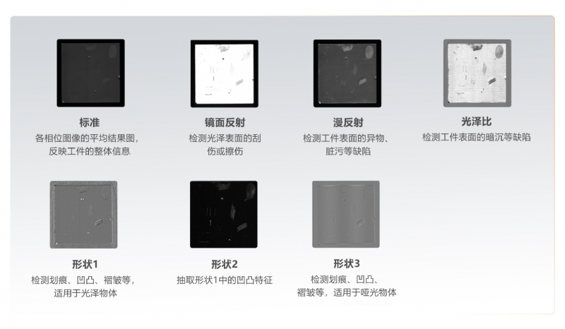 傳統(tǒng)檢測方案往往需要針對不同缺陷定制專用設備,不僅成本高昂,而且標準化程度低。而2.5D視覺技術則大為不同,它僅需單個光源就能同時檢測多種類型的缺陷,且不受角度限制,這大大提升了方案的通用性和效率。更重要的是,一次拍攝就能輸出多類型的結(jié)果圖,從細小的凹凸到復雜的劃痕,再到微小的臟污,展現(xiàn)了強大的復合檢測功能。