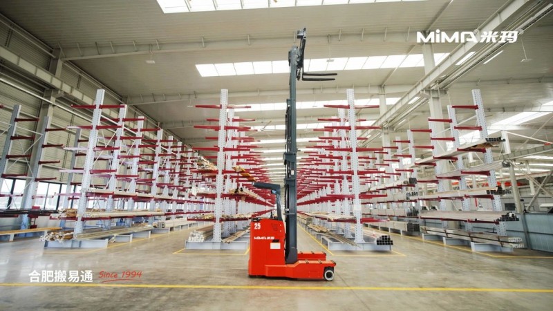 2、為了滿足長重物料的靈活搬運需求,建議客戶采購并使用MiMA米瑪窄體全向叉車MQ25,這款叉車額定載荷2.5噸,擁有多種行駛模式,側行通道更小,能夠完美適配窄巷道作業環境。