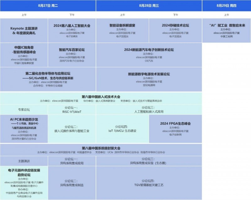 elexcon深圳國際電子展將于 2024年8月27-29日 在深圳會展中心(福田) 舉辦,圍繞嵌入式AI產業,現場重要展商及同期重要活動已公布,活動亮點先睹為快!