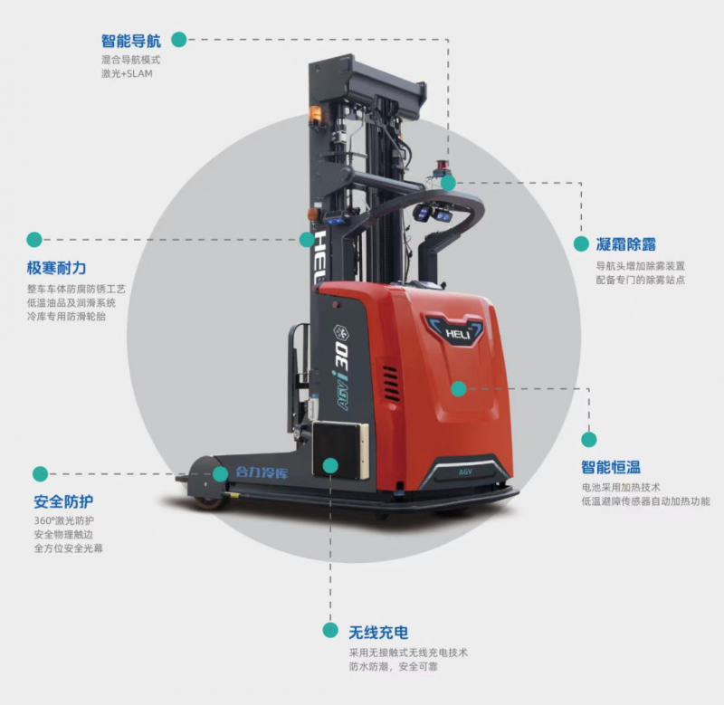 合力憑借深厚的技術(shù)沉淀和豐富的制造經(jīng)驗,推出冷鏈專用版叉車AGV。基于“優(yōu)質(zhì)本體+先進(jìn)控制+溫濕系統(tǒng)+智能平臺”打造領(lǐng)先一代的冷庫叉車AGV—CQD系列,成功攻克了-30℃極低溫度環(huán)境下的“高位存儲+智能堆疊+接駁搬運”等場景一體化作業(yè)難題。