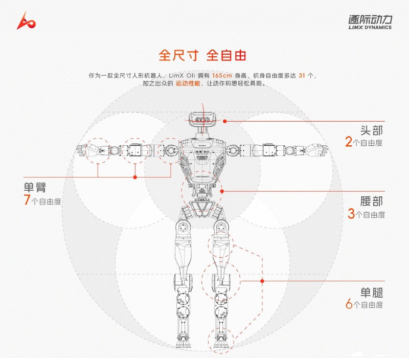 LimX Oli在這一點上沒有選擇“妥協(xié)式”的小尺寸方案,而是直接采用了165cm 的標準身高與31個機身主動自由度,構(gòu)建出貼近人類軀體結(jié)構(gòu)的通用人形構(gòu)型。其自由度分布涵蓋: