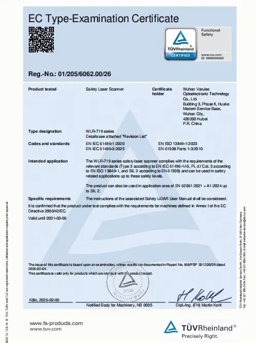 在此背景下,武漢萬集光電技術有限公司重磅發布全球首款成功通過德國TÜV Rheinland國際權威機構功能安全認證的3D安全激光雷達WLR-719E,該產品達到EN 61508 SIL2與EN ISO 13849 PLd國際安全等級標準。這不僅是一款重磅產品的面市,更是對工業激光雷達 “真安全” 標準的行業正名,為產業發展樹立了全新標桿。