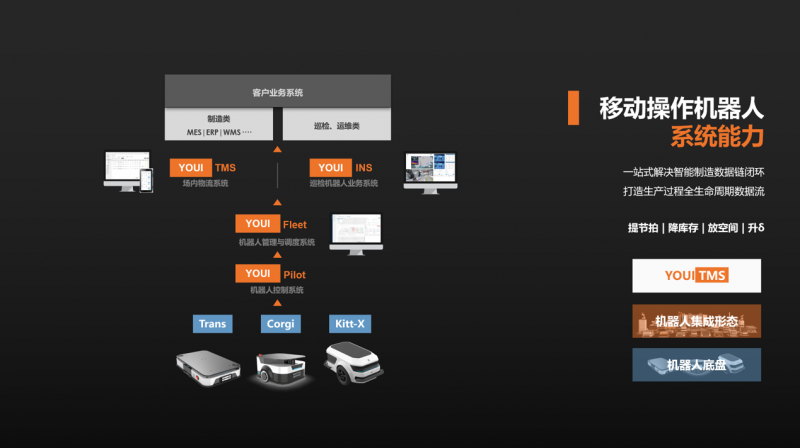 優(yōu)艾智合是國內(nèi)最早布局軟件系統(tǒng)的移動機(jī)器人企業(yè)。以針對制造業(yè)打造的YOUI TMS智慧物流系統(tǒng)為例,其能將移動機(jī)器人在工序間的物理流轉(zhuǎn)升級為數(shù)據(jù)連接,具備根據(jù)ERP、WMS、MES等企業(yè)信息系統(tǒng)進(jìn)行整體物流自主調(diào)度的能力,完成備料倉到產(chǎn)線再至成品倉的物流數(shù)據(jù)全覆蓋。