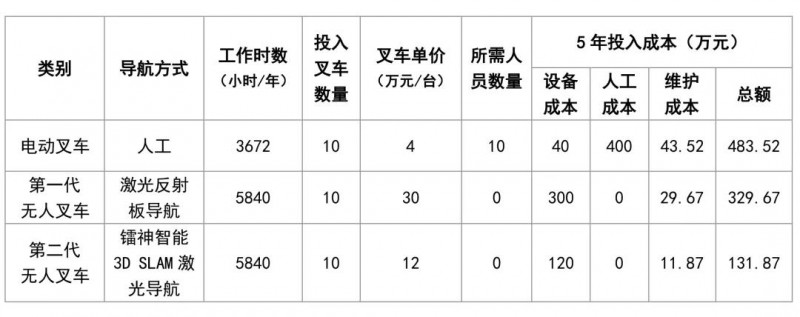 上表假定了某倉庫分別投入10輛電動叉車、激光反射板導(dǎo)航叉車、3D SLAM激光導(dǎo)航叉車,并以5年折舊進(jìn)行投資回報對比分析。顯然,人工操作的電動叉車投入成本最高,經(jīng)濟(jì)回報效益最低;激光反射板導(dǎo)航叉車雖然單臺叉車成本高,但在五年折舊期后總投入還是比人工的電動叉車要節(jié)省了153.85萬元,近32%的成本;而采用鐳神智能3D SLAM激光導(dǎo)航方案的無人叉車,五年總投入成本僅131.87萬,比人工電動叉車節(jié)省了73%的投入成本、59%的時間成本,而且五年期間倉庫可以靈活進(jìn)行擴(kuò)建或調(diào)整,全面滿足工業(yè)互聯(lián)網(wǎng)時代下客戶終端市場隨時變化的需求,具有更突出的綜合效益!