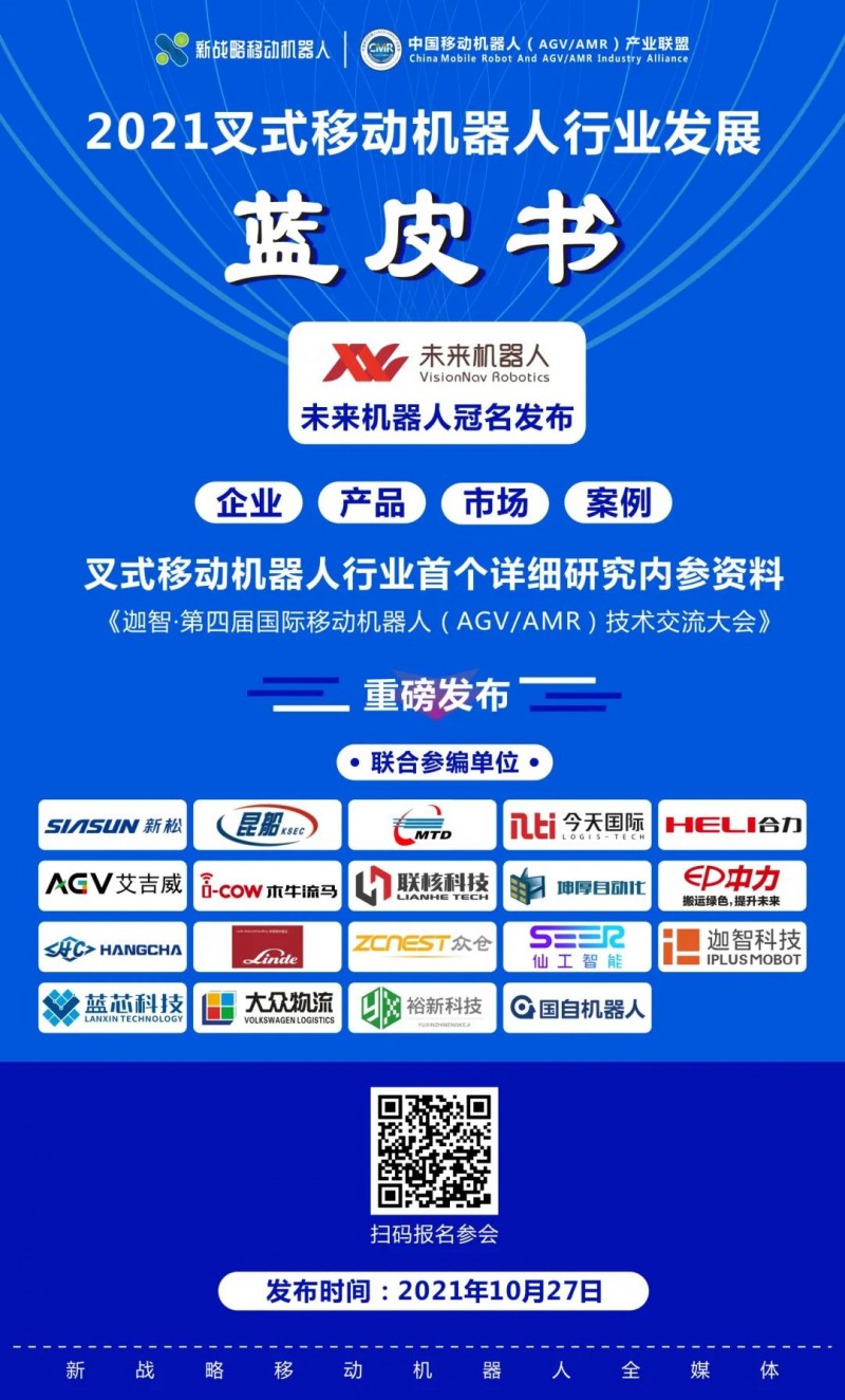 機器人(AGV/AMR)產業聯盟主辦、《物流搬運機器人》雜志社 、新戰略移動機器人產業研究所 、CeMAT ASIA承辦的“迦智科技·第四屆中國國際移動機器人(AGV/AMR)產業發展大會”上,《2021叉式移動機器人行業發展藍皮書》將正式發布!