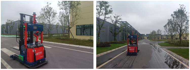哈工庫訊為通威太陽能打造的室外融合導航無人叉車項目,無人叉車室外激光導引使用GPS/北斗融合+3D雷達+視覺導引方式,提供穩定可靠的提供高精度位姿,對環境要求低,室內外通用,使用簡單方便,降低人工維護難度,無需布置靶標,解決靶標布局布置困難等。無人叉車能夠適應各種天氣氣象?;旌蠈Ш剿惴ㄌ峁┛煽康母呔鹊亩ㄎ恍畔?,融合GPS/北斗定位、自然導航和靶標導航,定位精度高、操作簡單、環境適應性高。該算法對激光雷達點云提供異常處理,可有效的對抗室外雨、雪、霧、大風等惡劣天氣,不受光照影響,支持室內外穿行,穩定提供可靠定位信息,可保證重復定位精度在±5mm以內;該算法支持上下坡、平地建圖導航功能;算法內部自適應支持多種工作場景,配置簡單方便,非專業人員也可以完成配置并使用;該算法支持多次建圖、在線建圖、離線建圖等功能。