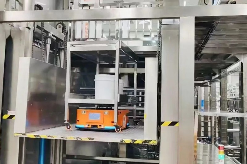 同時,由Gulf-1400-CDD無人叉車機器人負責原材料從原料倉到乳化車間的搬運、空桶的產線返回、半成品從產線到車間的中轉、包材的產線搬運,搭配FMS調度管理系統,實現最優任務分配方案,讓倉儲物流整體效能最大化。
