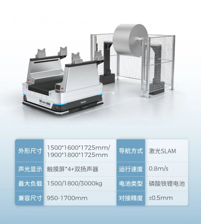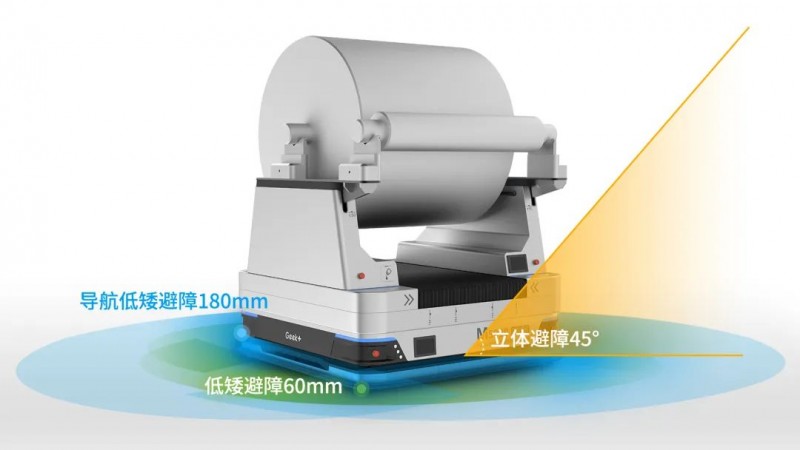 極智嘉雙舉升機(jī)器人采用激光傳感器,融合視覺算法,實(shí)現(xiàn)與機(jī)臺、緩存架的精準(zhǔn)對接,各向?qū)泳瓤蛇_(dá)±0.5mm。搭配使用光電傳感器,可識別出料軸在叉臂上發(fā)生的位置偏移,并調(diào)整動(dòng)作自動(dòng)糾偏,有效防止拖料、掉料,降低安全風(fēng)險(xiǎn)和生產(chǎn)損失。